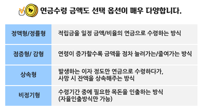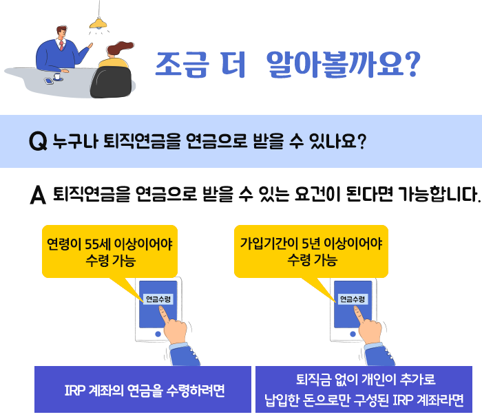 만약 퇴직금 없이 순수하게 개인이 추가로 납입한 돈으로만 구성된 IRP 계좌라면 “가입 기간 5년 이상” 요건까지 갖추어야 연금으로 수령이 가능합니다.
