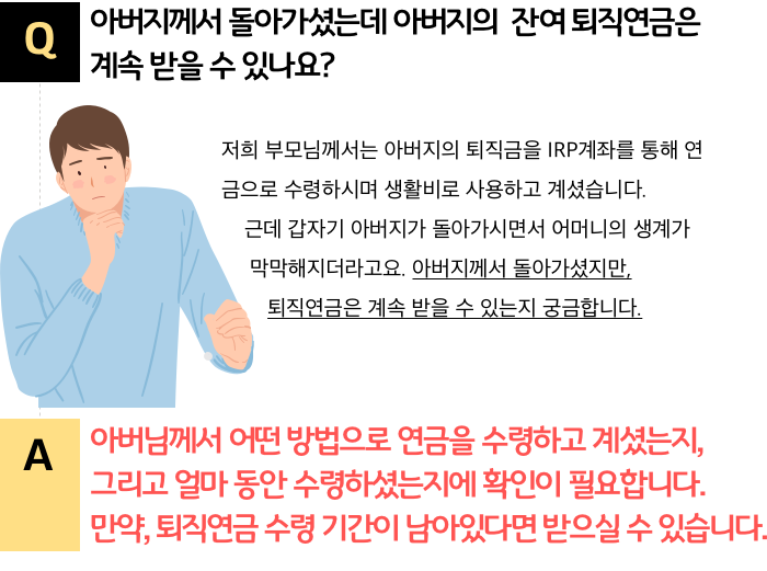 퇴직연금의 상속 상황에서는 남아있는 연금 수령기간 또는 금액을 연금으로 승계할 수 있는지는 금융회사 및 가입 상품에 따라 다르기 때문에 해당 시점에 확인해야 합니다.