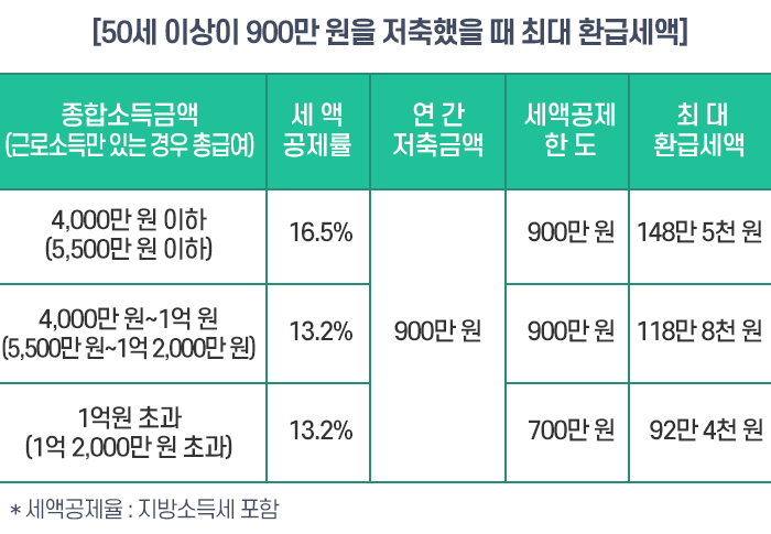 종합소득이 4,000만 원(근로소득만 있는 경우 총 급여 5,500만 원)보다 적으면, 세액공제 한도 내에서 저축 금액의 16.5%에 해당하는 세금을 돌려받습니다.