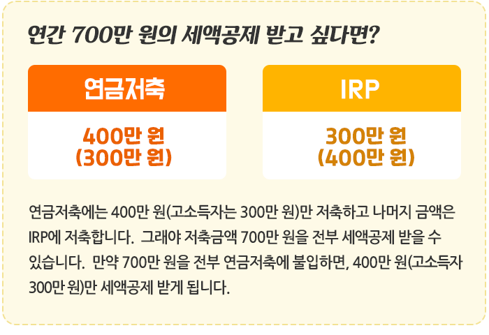 하지만 IRP 가입자는 소득 규모에 상관없이 최대 700만 원을 세액공제받을 수 있습니다.