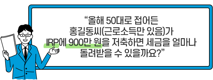 연금저축에만 가입한 사람은 연간 최대 600만 원을, IRP까지 이용하면 최대 900만 원의 세액공제를 받을 수 있습니다.