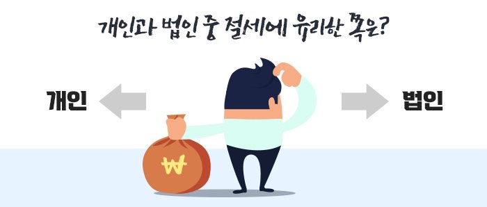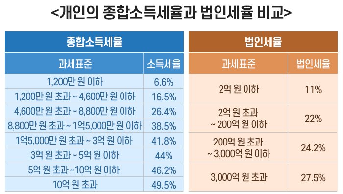 개인의 소득세와 법인의 법인세는 과세범위, 세율 등 많은 부분이 다릅니다. 일반적으로 어느 한쪽이 절세에 유리하다 이야기할 수 없습니다.