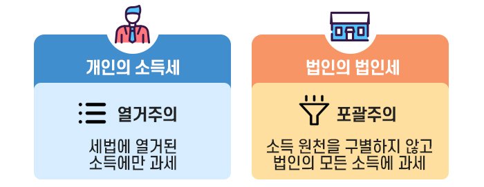 개인의 소득은 소득의 원천별로 종합소득(이자, 배당, 사업, 근로, 연금, 기타), 양도소득, 퇴직소득으로 나누어 다르게 과세하는 반면, 법인의 소득은 소득 원천을 구별하지 않고 모두 법인세로 과세됩니다.