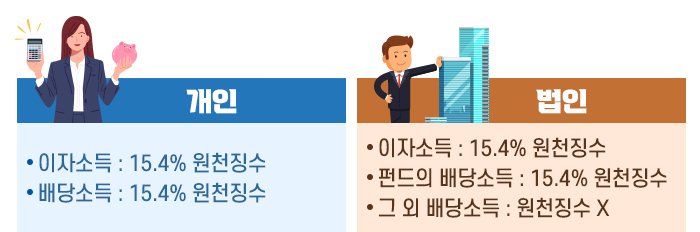 금융상품에 투자하여 이자소득 및 배당소득이 발생하면 은행ㆍ증권사 등 금융회사에서 원천징수를 하는데, 원천징수에 있어서도 개인과 법인의 차이가 있습니다.