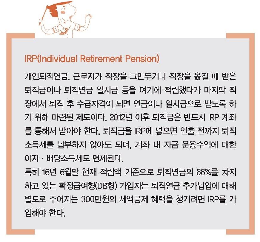 자산가치가 하락하지 않게 해주어야 한다. 이 경우에도 IRP가 적격이다. 어차피 생활비 용도면 한 번에 목돈을 인출할 필요가 없다.