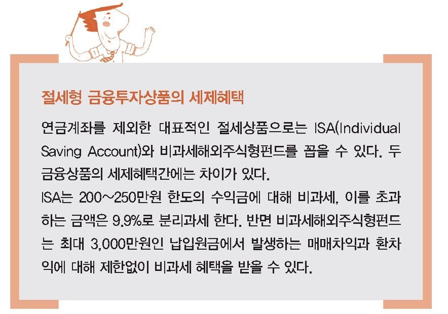 또한 남은 금융자산의 운용에서도 ISA(Individual Saving Account)나 비과세해외주식형펀드를 활용하면 다양한 세제 혜택을 누릴 수 있다.