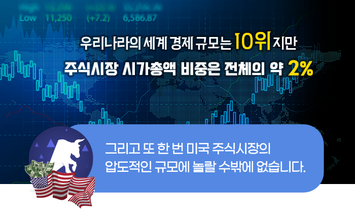 전 세계 주식시장의 약 45%를 차지하고 있는 미국의 주식시장은 그 규모만 해도 우리나라 주식시장의 20배가 넘습니다.