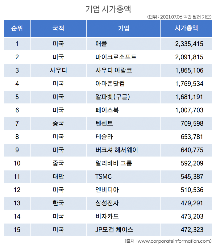 2021년 7월 6일 기준 글로벌 기업 시가총액 자료를 보면 앞에서 언급한 애플, MS, 아마존, 구글(알파벳) 같은 기업들이 Top10안에 있는 것을 확인할 수 있습니다.
