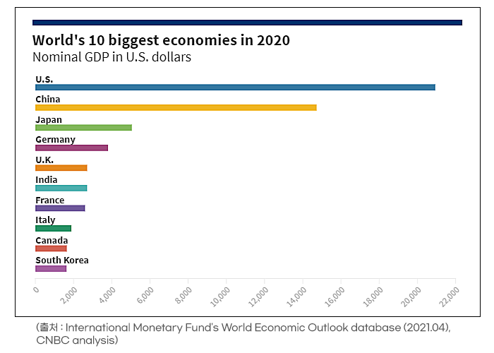 미국 CNBC가 분석한 ‘IMF 2020년 세계 경제전망치’ 자료에 따르면 우리나라가 명목 국내총생산(GDP) 순위에서 브라질을 대신하여 10위에 진입했다고 합니다.