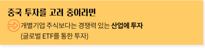 즉, 중국 투자를 고려하고 있다면 개별기업 주식보다 주식시장 내지는 중국의 경쟁력 있는 산업에 투자함으로써 개별기업의 불확실성에 대한 리스크를 덜며 투자하는 것이 좋습니다.
