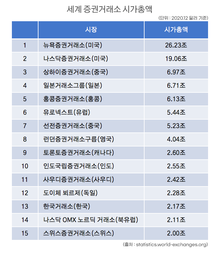 주식시장의 시가총액은 어찌 보면 그 나라의 경제력을 상징하는 또 다른 수치일 수 있습니다. 2020년 12월 기준으로 우리나라의 주식시장 시가총액은 세계 13위권입니다.