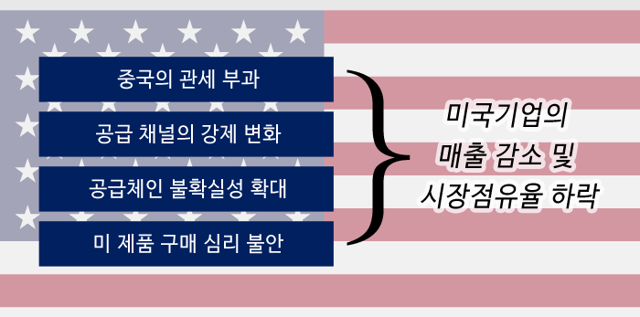 미국 기업들은 중국의 관세 부과, 공급 채널의 강제 변화, 미국산 제품 공급 체인 불확실성 확대, 중국 소비자들의 미 제품 구매 심리 불안 등으로 매출 감소 및 시장점유율 하락을 겪고 있다.