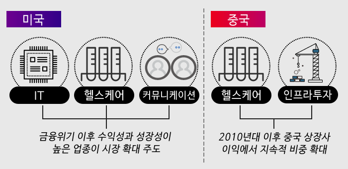 미국은 금융위기 이후 IT와 헬스케어, 커뮤니케이션 등 수익성과 성장성이 높은 업종이 시장 확대를 주도했으며, 이들 업종이 차지하는 매출 및 이익 비중 또한 확대됐다. 이에 수익성 측면에서 미국 증시의 매력도는 금융위기 이후 오히려 개선됐다. 이러한 업종들이 높은 이익 지배력을 확보한 상황에서 미국 증시의 이익 추정치는 2018년 연말 이후 다른 선진국 증시 대비 빠르게 회복되었다.