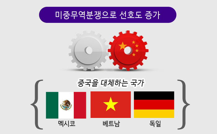 2019년 상반기 미국이 중국으로부터 수입한 금액이 300억 달러 줄었는데, 줄인 만큼을 멕시코, 베트남, 대만 등으로 돌렸다.