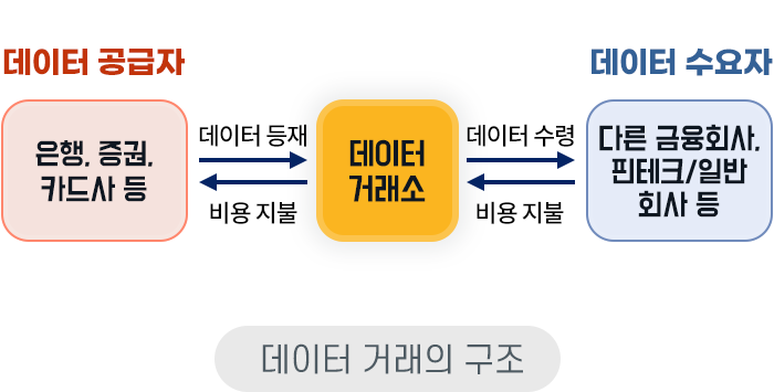 은행, 증권, 카드사가 자신들이 보유하고 있는 데이터의 내용과 포맷, 샘플을 거래소에 올리면 다른 금융회사나 핀테크 기업 또는 일반 회사가 비용을 지불하고 데이터를 사들여 이를 영업에 활용하는 형태가 됩니다.