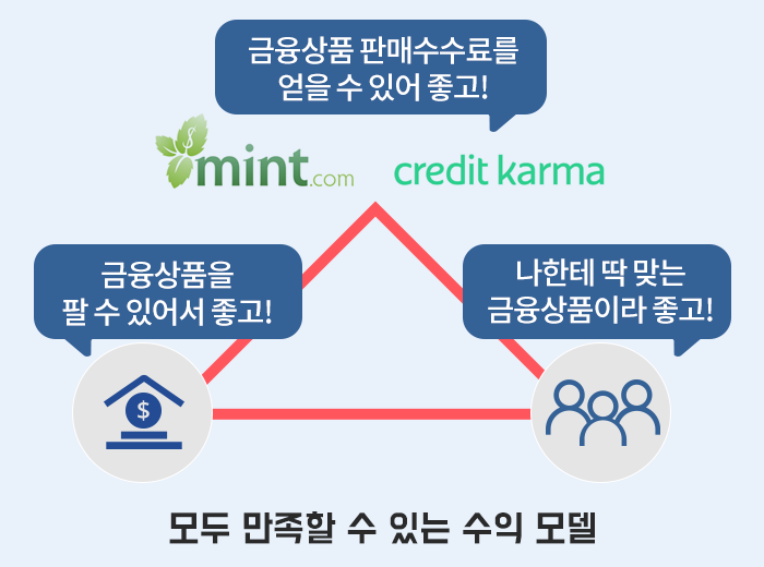 이 경우 이용자는 더 좋은 조건의 상품을 매입해 경제적으로 이득을 얻을 수 있어 좋고, 금융회사는 상품을 판매해 매출을 올려 좋으며, 민트는 금융회사가 제공하는 일정 판매 수수료 수익을 얻을 수 있어 좋습니다.