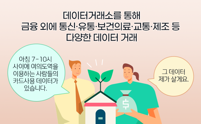 데이터 유통에 식별 가능한 개인정보만 없으면 금융 데이터 외에도 통신·유통·보건의료·교통·제조 등 다양한 데이터가 거래될 수 있습니다.