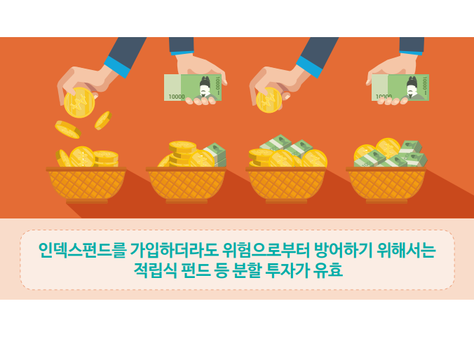 끝으로, 보수가 저렴하여 목돈을 한번에 투자하는 경우가 있는데 역시 인덱스펀드를 가입하더라도 위험으로부터 방어하기 위해서는 적립식 펀드 등 분할 투자가 유효하다.