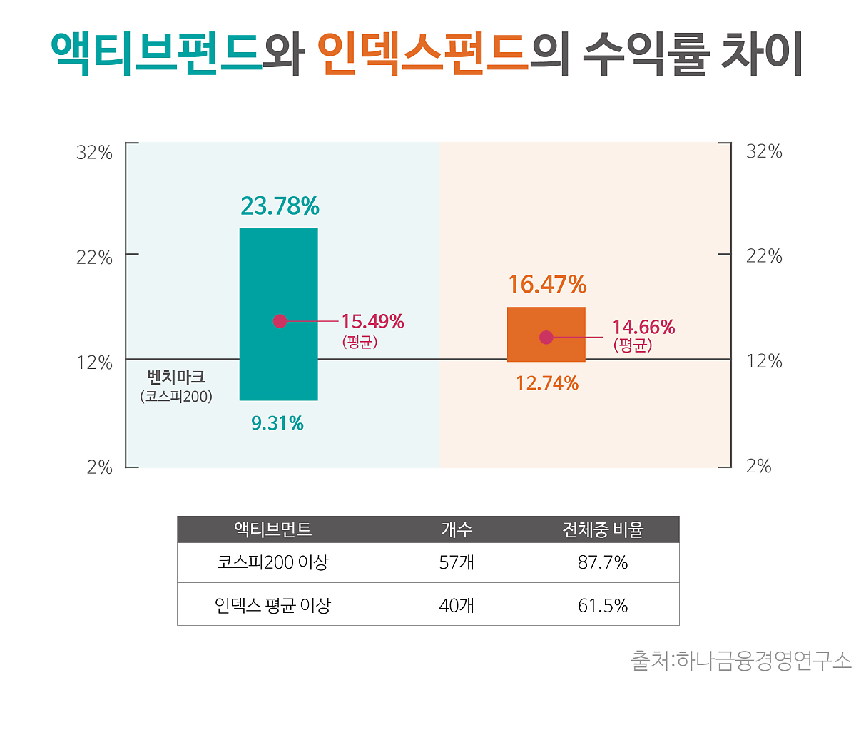 여기에 액티브펀드와 인덱스펀드의 차이를 명확히 보여주는 실증 분석 자료가 있다.
