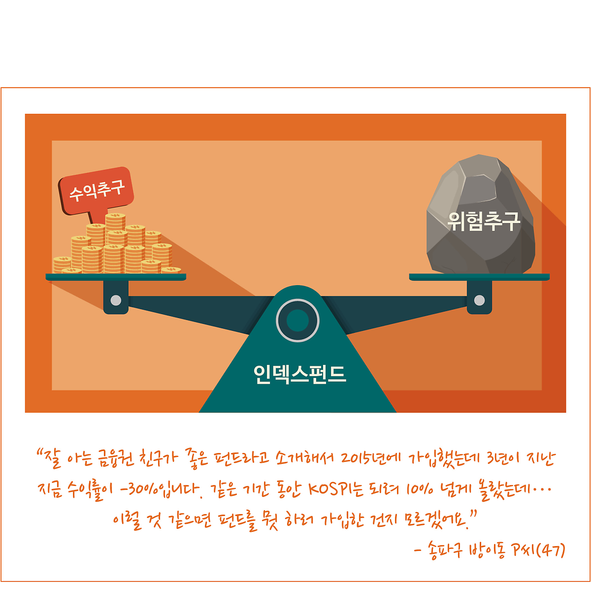 사람들이 예금 대신 투자를 하는 첫 번째 목적은 당연히 남들보다 더 높은 수익을 내기 위해서이다. 하지만 투자에는 수익에 상응하는 위험이 따르는데, 그 원인이 미래의 불확실성으로 인한 것인 만큼 이것을 없애는 것은 현실적으로 불가능하다. 다시 말해, 큰 수익을 냈다는 것은 반대로 그만큼 큰 손실을 볼 위험을 무릅썼다는 말과도 같다. 결국 양날의 검과 같은 수익 추구와 위험관리, 이 사이에서 가장 균형 잡힌 투자방법은 무엇일까? 필자는 특정 주식시장과 같은 수익률을 내기 위해 이를 추종하는 포트폴리오 투자를 하는 인덱스펀드를 꼽고자 한다. 위의 예와 같이 KOSPI200이 10% 움직였을 때 어떤 펀드는 -30%의 손실을 낼 수도 있지만, KOSPI200을 추종하는 인덱스펀드에 가입했다면10% 전후의 수익을 얻었을 수도 있었을 것이다.