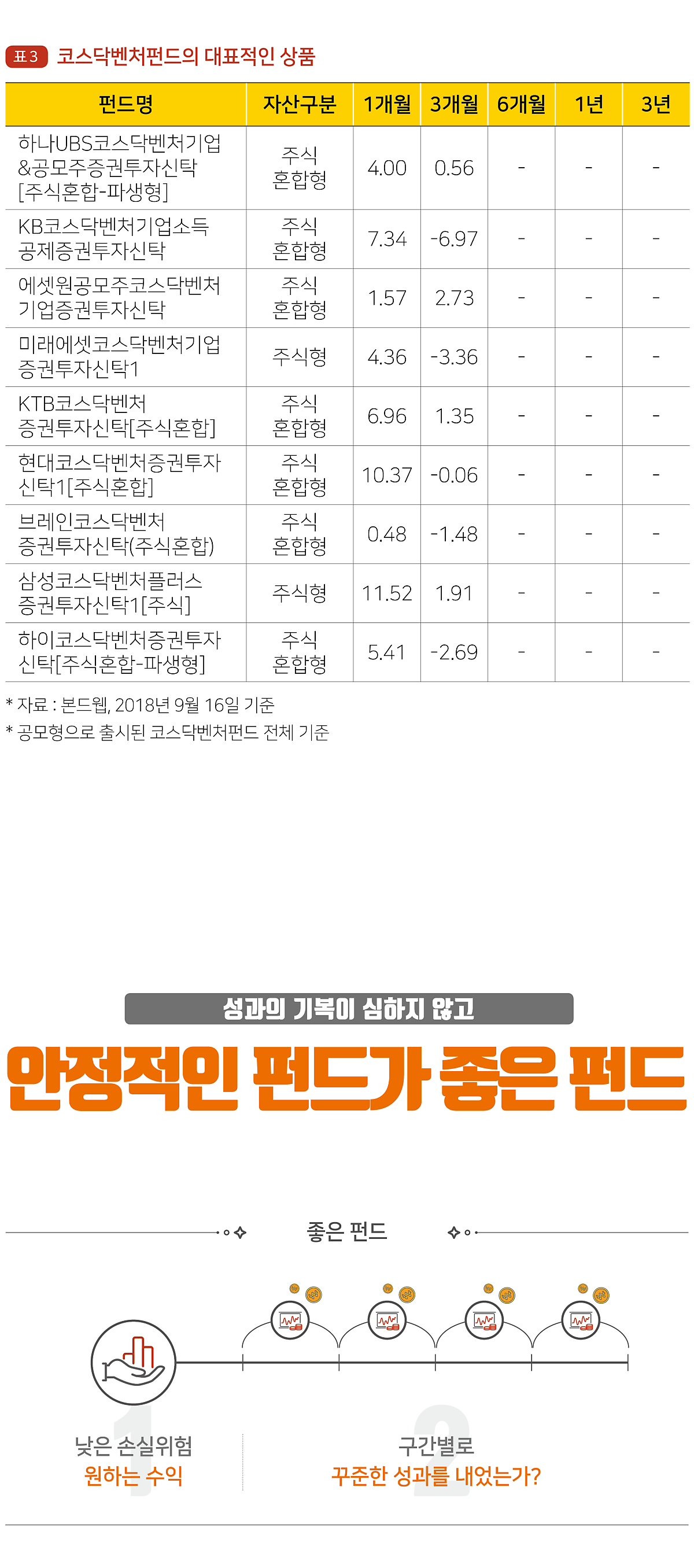 현재 시중에 공모형으로 출시된 코스닥벤처펀드의 대표적인 상품들을 표3 과 같이 정리했다. 공교롭게도 2018년도부터 증시 불안이 이어지면서 코스닥벤처펀드 또한 눈에 보이는 성과는 그다지 양호하지 못하나 향후 코스닥 지수의 상승을 전제로 공모주펀드 유형 중에서는 수익성이 가장 높다.