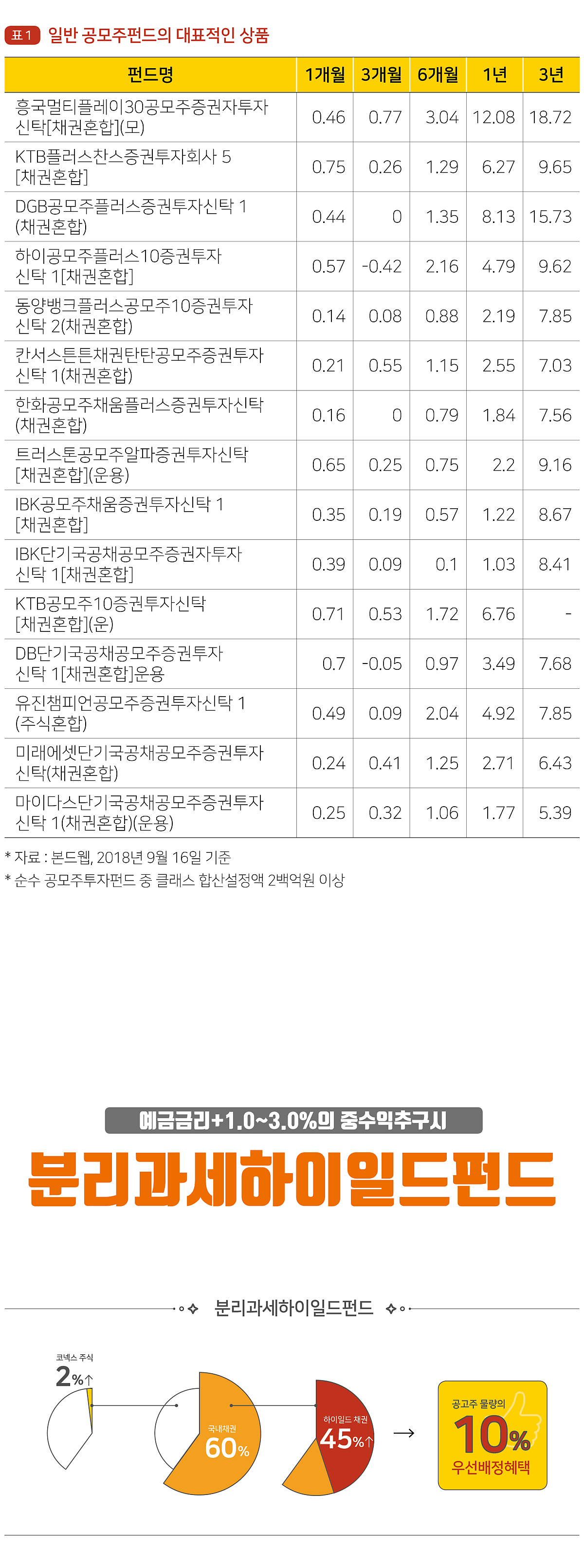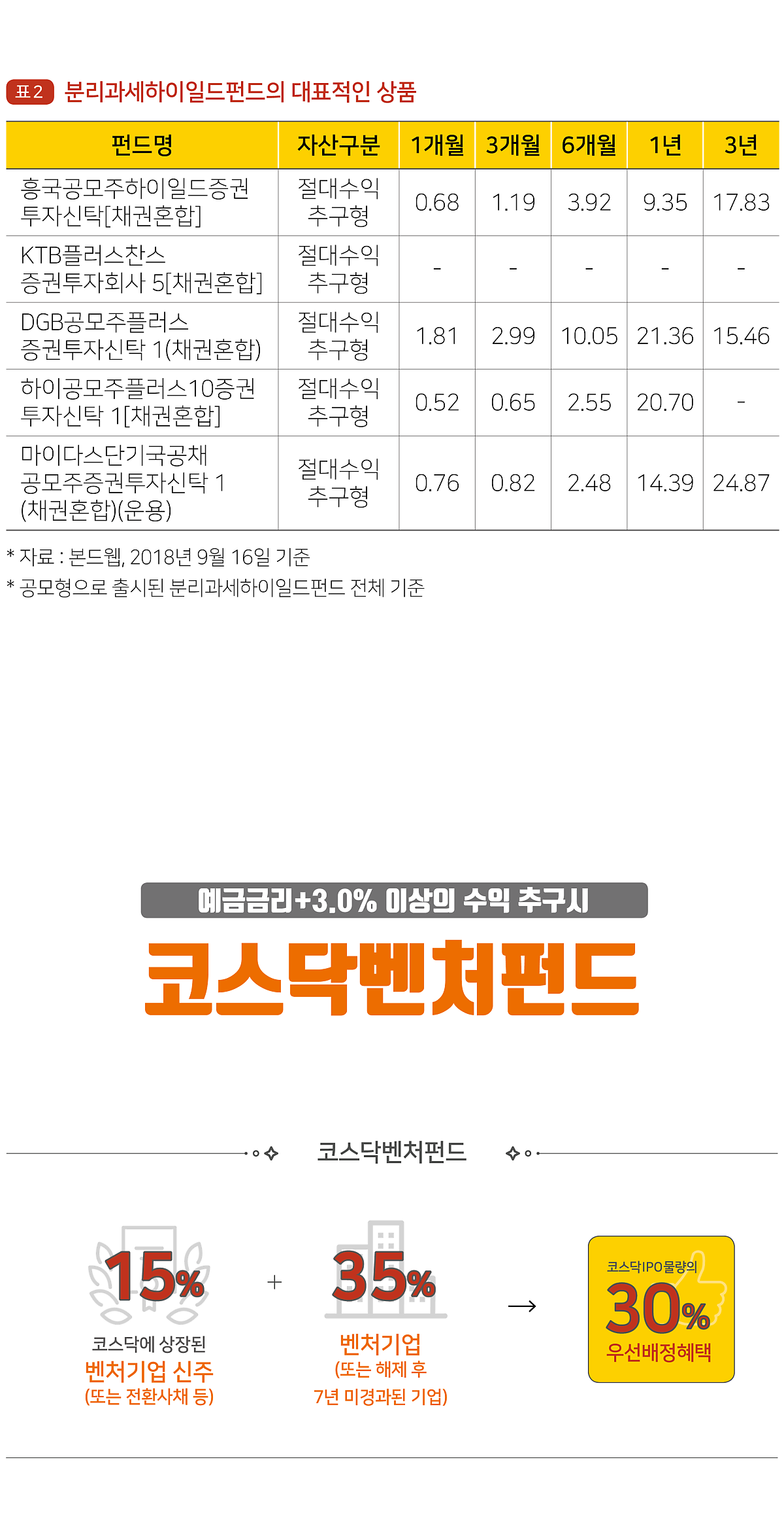 공모주 투자로 좀 더 높은 수익을 내고 싶은 투자자들에게 인기를 얻었던 상품이 바로 2014년부터 출시된 하이일드분리과세 공모주 펀드이다. 이 펀드들은 과거에 투자 시 일정금액에 발생한 금융소득에 대해 15.4% 분리과세를 해주어 ‘분리과세하이일드펀드’ 라는 명칭이 붙었다. 하지만 2017년 말로 분리과세 혜택이 종료됐다.
