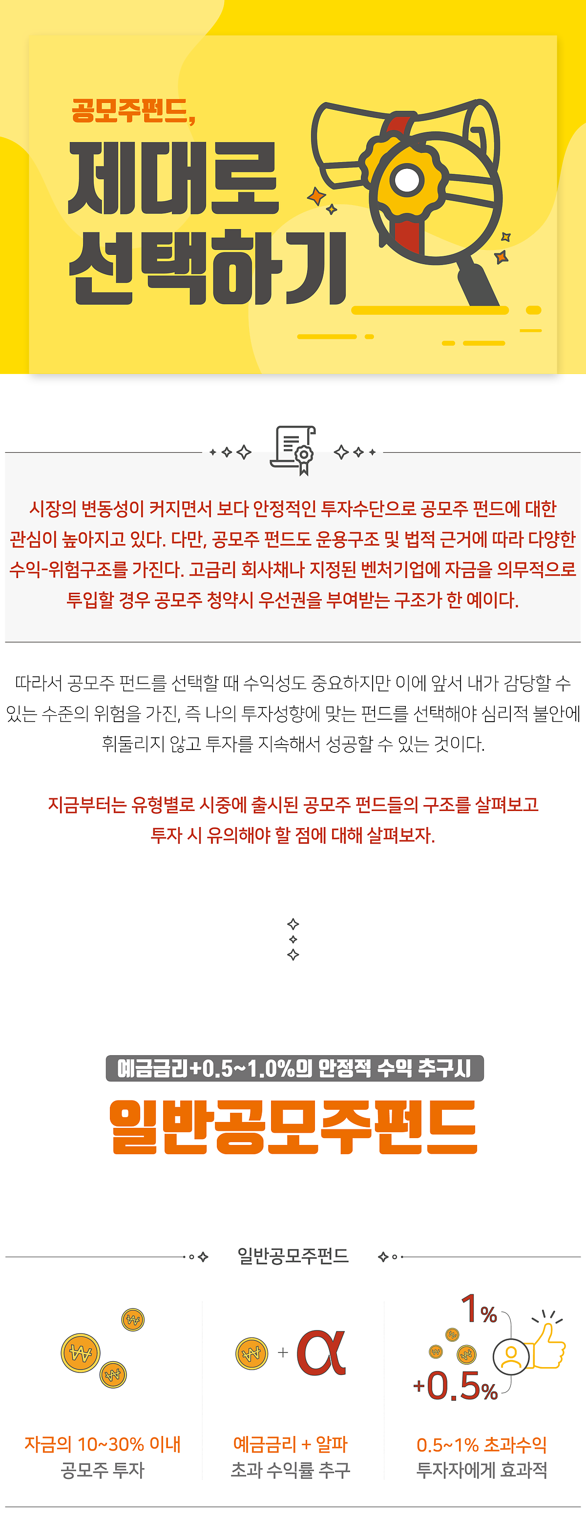 공모형 공모주펀드는 약관상 자금의 10~30% 이내만큼 공모주에 투자하여 ‘예금금리 +알파’의 초과 수익률을 추구한다. 평소 국공채 등 안정적인 채권으로 굴리다가 IPO가 있을 때만 잠깐 투자하고는 대부분 주식시장 상장 첫날 또는 보호예수(Lock-up) 기간 만료 시점에 즉시 팔아버리는 식으로 운용되기 때문에 통상 주식 편입비중이 상당히 낮다.