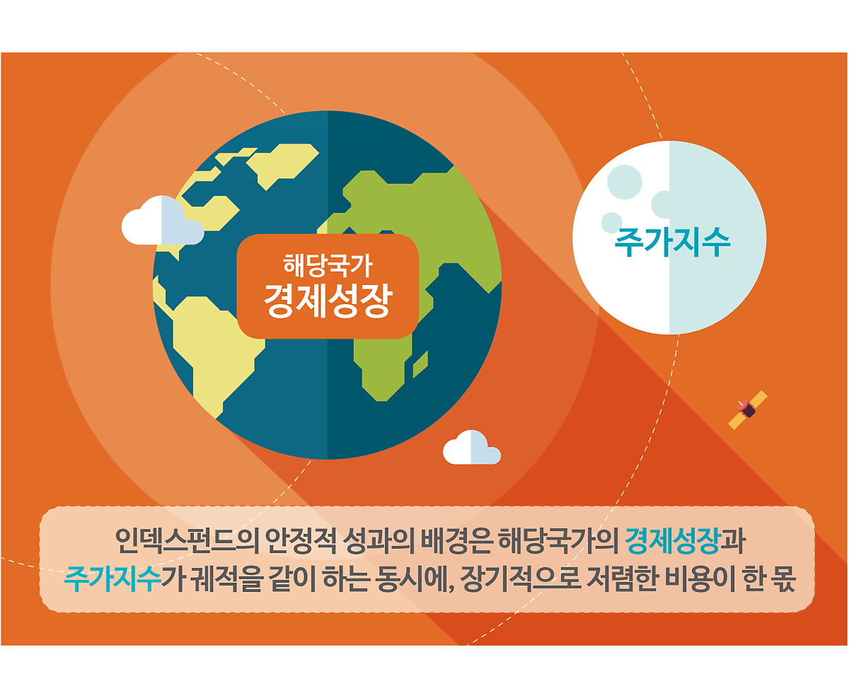 이러한 성과의 배경에는 해당국가의 경제성장과 주가지수가 궤적을 같이 하는 동시에, 장기적으로 저렴한 비용이 한몫을 하고 있기 때문이다. 인덱스펀드의 운용에 있어서 비용 절감이 가지는 중요성은 다음의 예로 알 수 있다.