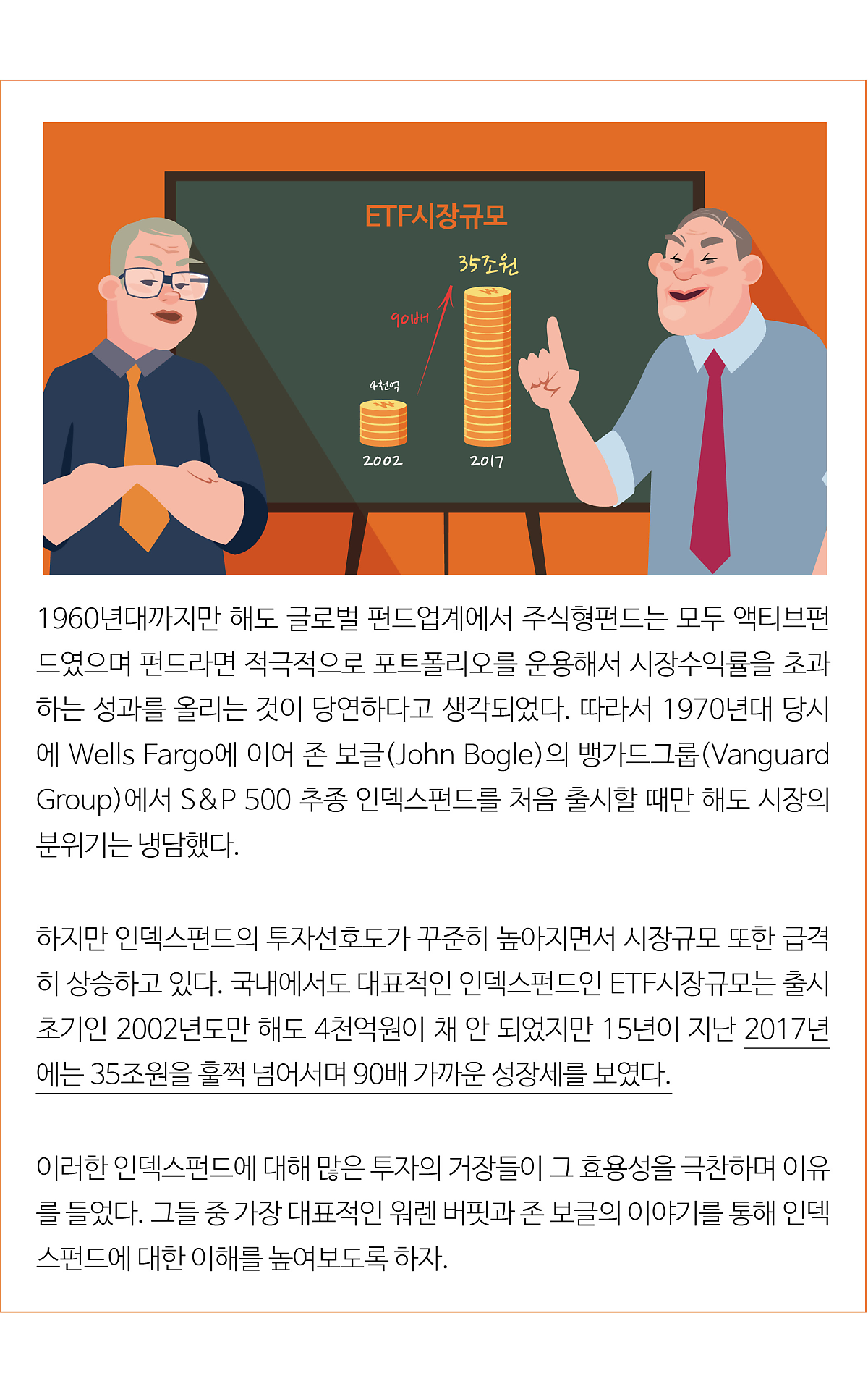 인덱스펀드는 투자계의 거장으로 불리는 워렌버핏과 존 보글의 일례로 알 수 있듯이, 장기적인 안목을 가진 투자자들에게 적합한 펀드이다. 누군가의 ‘몇 십배의 수익을 얻었다!’라는 맹목적인 신기루를 쫓기보다 느긋하게 기다리는 인덱스펀드를 주목할 필요가 있다.