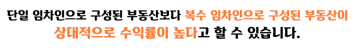 따라서 신용도가 높은 임차인이 임대한 부동산은 상대적으로 수익률이 낮습니다. 반면에 복수의 임차인으로 구성된 부동산의 경우 임차인 각각의 임대차 계약이 상이할 수 있기 때문에 고정적인 배당 수익이 변동될 수 있습니다.