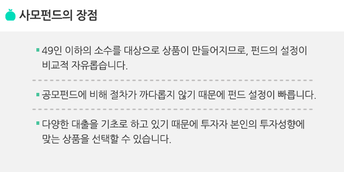 반면 사모펀드는 투자권유인 수(49인 이하) 제한과 최소 투자금액 기준(현재 1억 → 향후 3억으로 증가될 것으로 예상됨) 등의 규정만 준수하면 공모펀드보다 상대적으로 자유롭게 설정됩니다. 그래서 다양한 사모펀드 형태의 대체투자상품이 만들어지고 있습니다.