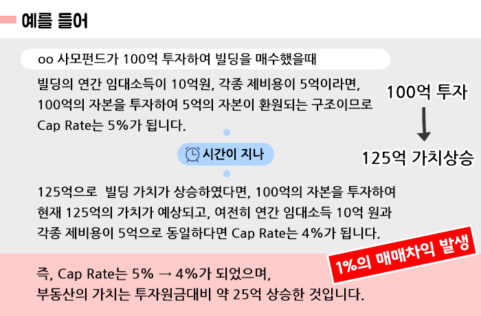 부동산을 매입 시점에 5%의 Cap Rate으로 매수해서 매도 시점에 4% Cap Rate으로 매도했다면 1%의 매매차익이 발생합니다. 반대로 6%의 Cap Rate으로 매도했다면 1% 매매차손이 발생합니다.
