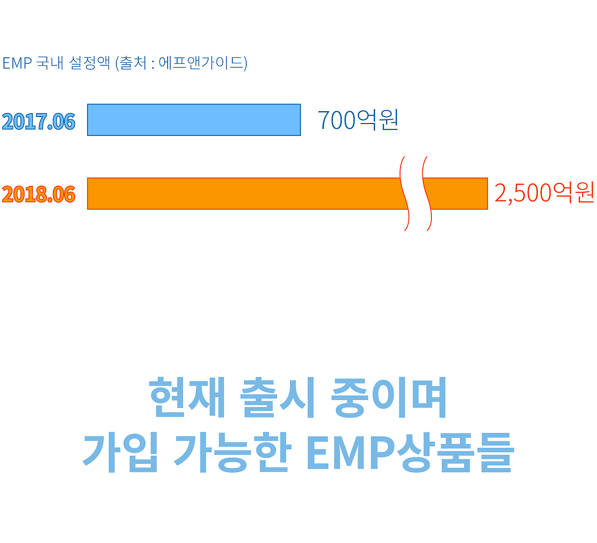 현재 EMP 펀드로 분류하는 기준이 모호해 정확한 통계는 없지만 대략 20개 내외로 판단된다. [표]는 현재 EMP라는 명칭이 포함되어 등록된 국내 주요 EMP펀드들인데 2018년 8월 2일 현재 출시한 펀드의 수는 미래에셋자산운용이 가장 많은 것으로 나타나 있으며 KB자산운용, 신한BNPP자산운용 등이 그 뒤를 잇고 있다.