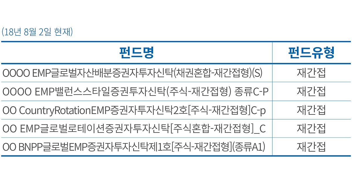비용 또한 저렴하다. 일반 공모액티브펀드가 하는 초과수익전략, 글로벌 멀티에셋전략,테마투자전략을 대부분 구현할 수 있지만 수수료는 상대적으로 낮기 때문이다. 현재 글로벌 멀티에셋전략을 쓰는 웬만한 액티브펀드들은 연간 총보수가 2%를 훌쩍 넘지만 같은 전략의 EMP펀드들은 0.8~1.3% 수준이다.