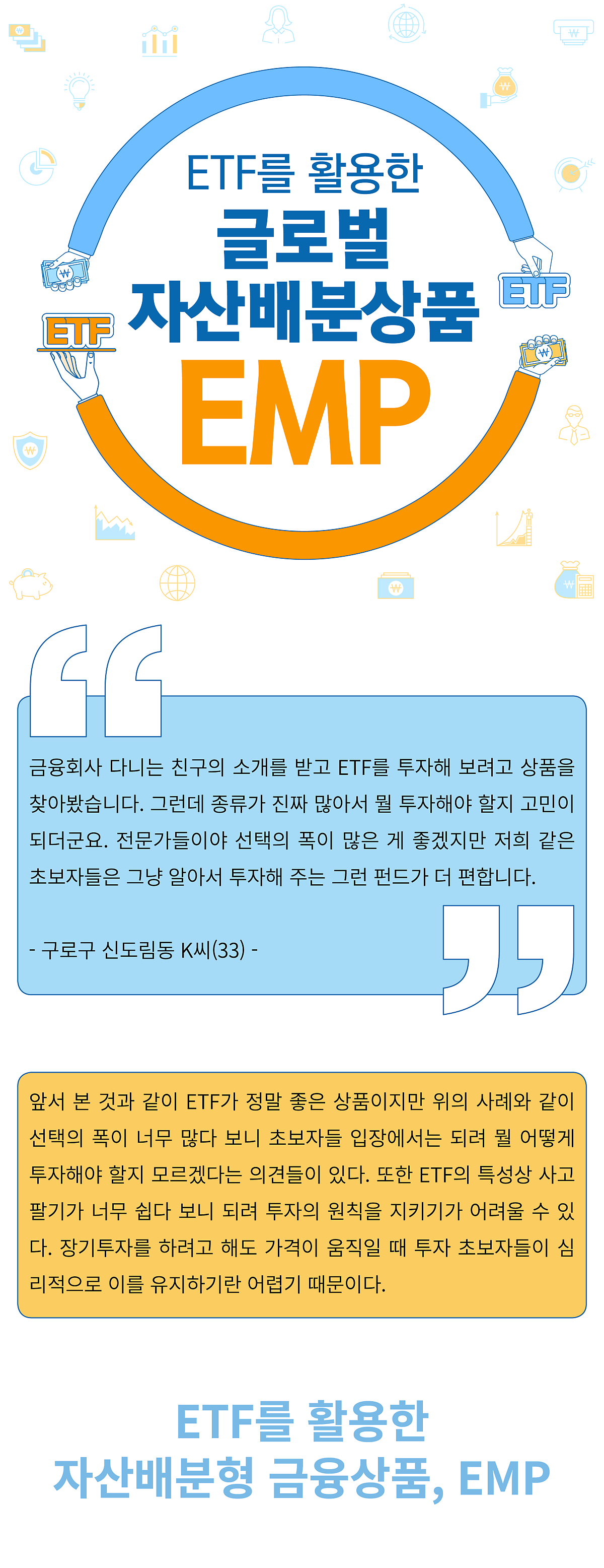 EMP상품의 가장 큰 장점은 다양한 ETF로 포트폴리오 구성이 가능해 과거 개별주식으로 할 때보다 훨씬 위험분산이 잘 된 투자성향별 효율적 자산배분이 가능해졌다는 것이다.예를 들어 EMP 펀드를 운용하는 펀드매니저들은 전 세계의 5,500개에 달하는 거래 상품들 중에서 펀드 특성에 따라 10~20여 개의 ETF에 분산투자를 하면서 상황에 따라 적절한 펀드를 새로 갈아 끼우게 된다.