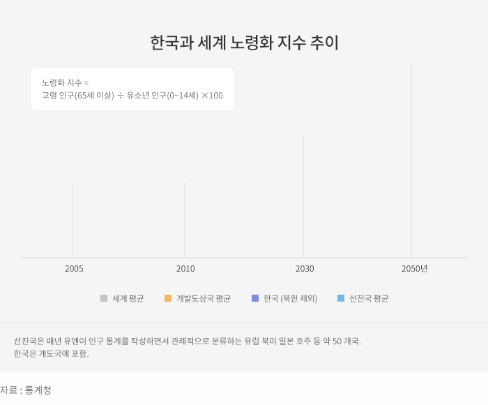 한국의 2018년 65세 이상 인구는 738만 명으로 전체 인구 중 14.3%를 차지하고 있으며, 노령화 지수(65세 이상 고령 인구/0~14세 유소년 인구*100)는 2010년 97(세계 평균 28)에서 2050년 429(세계 평균 82)로 증가할 것으로 전망됩니다(통계청).
