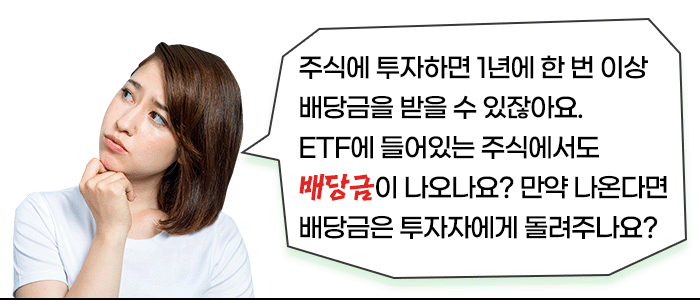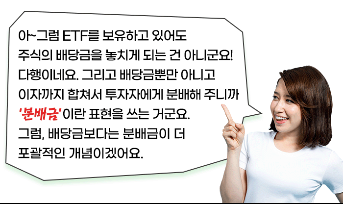ETF에서는 이를 모두 모아서 투자자에게 ‘분배금’으로 지급합니다. 정확한 표현은 ‘분배금’이지만, 편의상 ‘배당금’이라고 쓰는 경우도 많습니다.