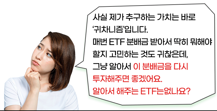 즉, ETF가 보유하고 있는 주식에서 나오는 분배금을 그대로 다시 재투자하는 구조입니다. 귀차니즘이 만들어낸 새로운 형태의 ETF라고 할 수 있죠!