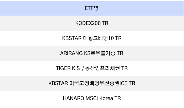 예를 들면 KODEX 200 ETF는 KOSPI200을 추종하는 주식을 구성하고 있다가 주식에서 나오는 분배금을 투자자에게 지급한다면, KODEX 200 TR ETF는 그 분배금을 지급하지 않고 ETF 내에서 다시 재투자를 자동으로 실행합니다.