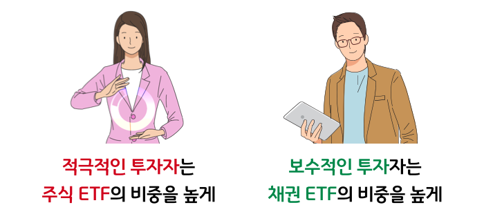 적극적인 투자자는 상대적으로 수익률이 낮은 채권 ETF보다는 주식 ETF의 비중을 높게 설정하고, 보수적인 투자자는 상대적으로 위험성이 높은 주식 ETF보다는 채권 ETF의 비중을 높게 설정하는 것이 바람직할 것입니다.