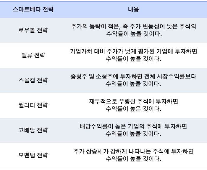 일반적으로 스마트베타 전략은 초과수익률을 달성하기 위한 방법에 따라 분류되는데 다음 표에 설명된 6가지 전략들이 대표적인 스마트베타 전략입니다.