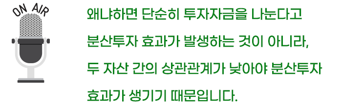 좀 전문적으로 표현하면 ‘상관계수’로 측정하는데요, 이 상관계수가 낮으면 낮을수록 서로 다른 방향으로 움직이는 보완관계가 확실해집니다.