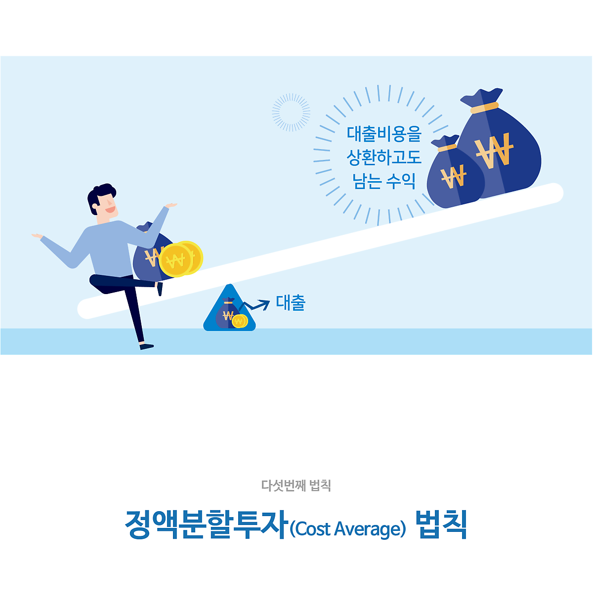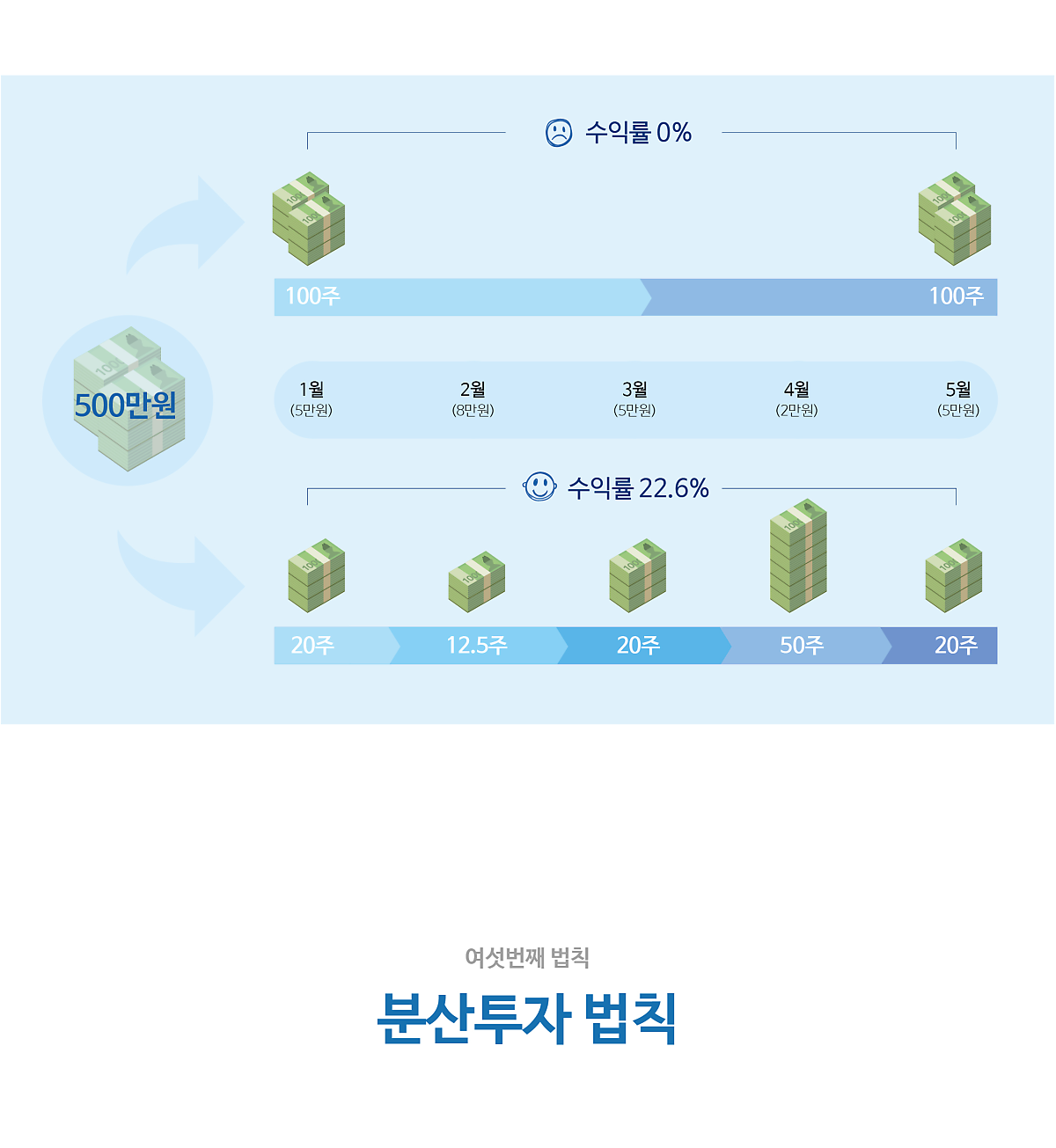 다섯 번째 소개할 법칙은, 투자를 할 때 정해진 금액으로 분할하여 꾸준히 투자를 하면 사는 가격이 낮아져서 결국 수익률이 높아진다는 정액분할투자법칙이다. 반대의 경우를 일시금 투자방식이라 한다. 정액분할투자방식은 주식투자자들이 사용하는 속칭 ‘물타기’ 기법과 비슷할 수 있는데 원리는 다음과 같다. 즉, 주식가격이 낮을 때는 동일한 금액으로 주식을 많이 사고, 가격이 높을 때는 주식을 적게 사는 것을 반복하게 된다. 이를 반복하다 보면 거치식으로 투자금을 한 번에 투자했을 때 보다 주식을 매입하는 가격이 낮아지게 되어 수익률이 높아지는 방법이다. 예를 들어, 500만원을 일시에 투자하는 경우와 100만원씩 1월부터 5월까지 5번에 분할하여 투자하는 경우를 비교해 보자. 주식가격은 1월에 5만원, 2월에 8만원, 3월에 5만원, 4월에 2만원, 5월에 5만원이라고 가정해 본다. 먼저 목돈을 투자하는 경우에는 500만원으로 5만원짜리 주식 100주를 구입하고 5월에 다시 팔았을 때 다시 5만원이므로 500만원을 받게 되어 수익률은 0%가 된다. 반대로 정액으로 분할해서 매월 투자하는 방법은 1월에 20주, 2월에 12.5주, 3월에 20주, 4월에 50주, 5월에 20주를 사게 되어 총 122.5주를 취득하게 되고 이를 판 가격(613만원)에서 산 가격(500만원)을 빼고 이를 산 가격(500만원)으로 나누어 보면 수익률은 22.6%가 나오는 것이다. 따라서 안정성을 높이고 수익률을 높이는 방법으로, 보편적으로 주식시장에서 가장 많이 활용되는 투자기법이다.