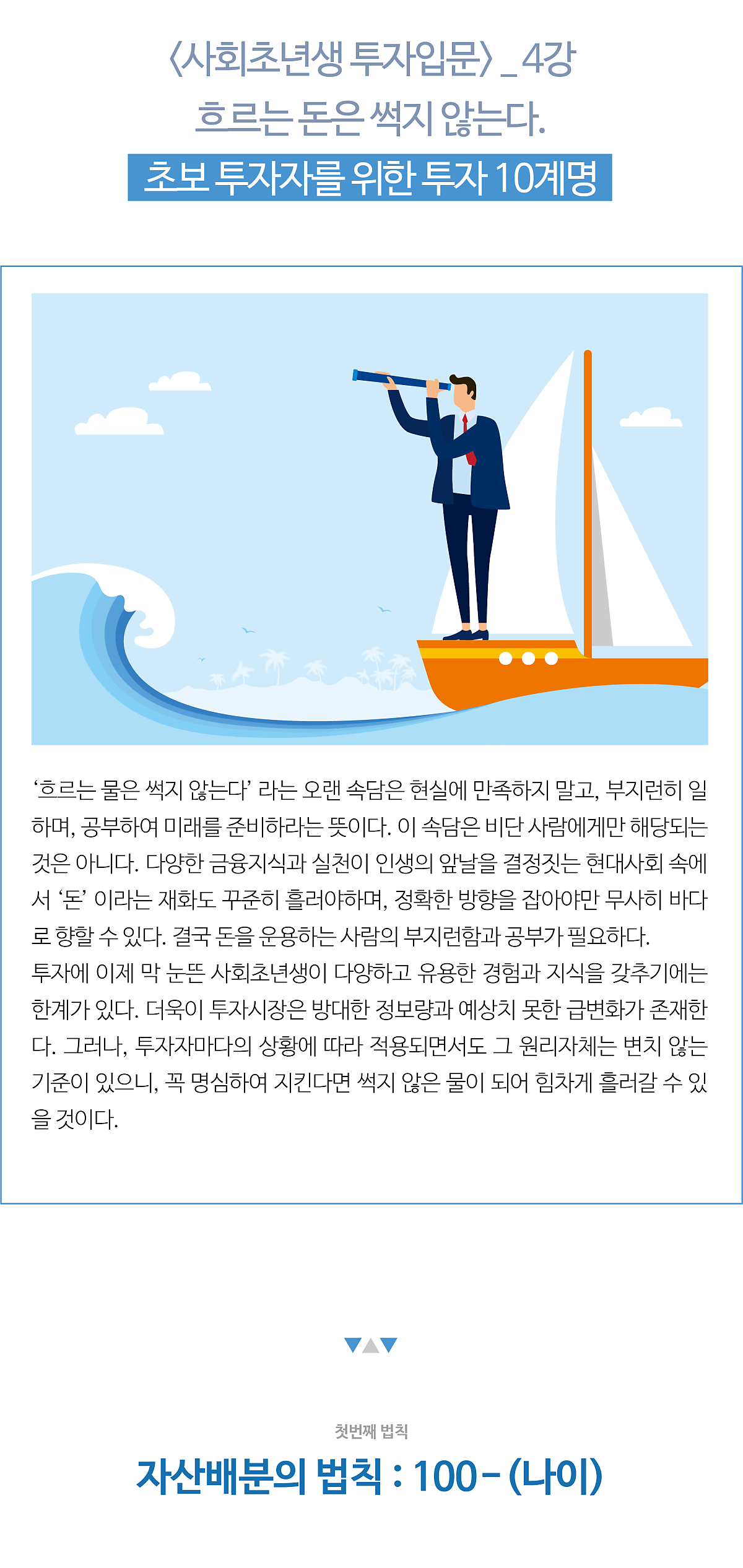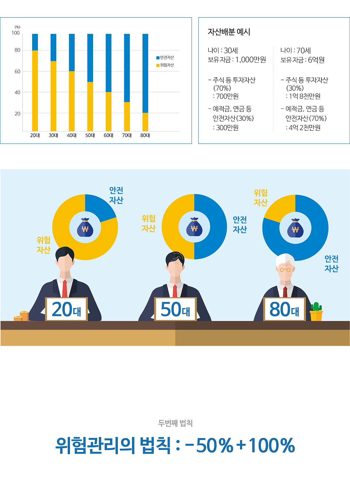 공식처럼 적어보면, ‘100-나이=투자비율(%)’로 표현된다. 보유한 자금을 100으로 잡았을 때, 나이만큼의 비율은 저축을 하고, ‘100-나이’를 뺀 만큼의 비율은 투자를 하라는 것이다. 나이가 젊은 경우에는 안전자산에 소액을 남기고, 공격적 투자를 하다가 행여 손실이 발생하여도 앞으로 회복할 시간이 많이 남아있게 된다. 하지만, 노후를 생각할 은퇴자의 경우는 보유한 자금을 안정적으로 지키고 위험자산에 투입하는 비중을 줄이는 것이 현명할 것이다. 물론, 사람마다 고유의 투자성향이 있고 개인적 재무현황과 건강 상태, 경기변동 등의 여러 변수는 많기 때문에 이 법칙이 정확하게 적용되지 않을 수도 있다. 그럼에도 ‘100-나이 법칙’은 자신의 연령에 맞추어 기본적으로 검토해야 할 투자의 가장 첫 번째 기준으로 여전히 유용하다.