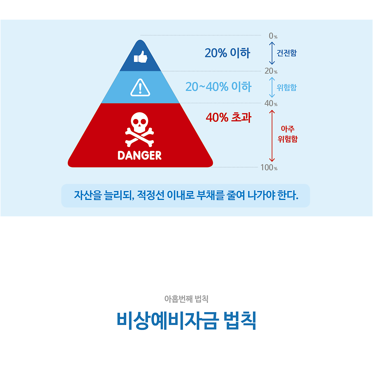 일반적으로 자산에서 부채의 비중이 20%이하이면 건전하다. 20-40%이하이면 위험하다. 40%를 초과하면 매우 위험한 상황이다. 대출원리금의 부담이 크기 때문이다. 따라서 주택을 구입하거나 전세담보대출을 할 때 유의해야 할 것은 자산대비 몇 %의 부채를 빌리는가 하는 것인데 최대 40%를 넘지 않는 것이 투자의 원칙이다. 단지 집값이 오를 것 같다는 판단만으로 집값은 5억인데 무리하게 3억의 대출을 받는다면 이는 60%의 대출을 빌리는 것이고, 이는 대출금리가 오른다든가 주택가격이 하락하게 되면 팔아도 대출금액을 상환하지 못하는 깡통주택의 위험이 있는 것이다. 자산을 늘리되 적정선 이내로 부채를 줄여 나가야 하는 것을 잊지 말아야 한다.