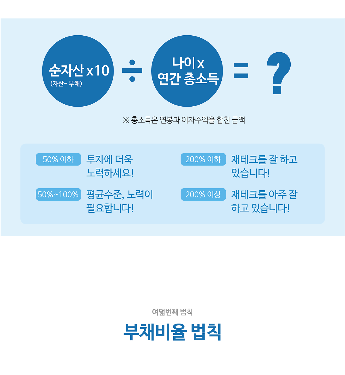 부자지수법칙은 순자산(자산-부채)에 10을 곱한 것을 나이와 연봉으로 나눈 수치를 백분율로 했을 때 그 수치에 따라서 부자가 될 가능성을 진단해 보는 것이다. 이는 현재의 자산이 나이와 연봉에 비례해서 자산운용을 잘 했는지 못했는지를 단적으로 표현하는 것으로 미국의 토마스 스탠리 박사가 개발한 법칙이다. 예를 들어 자산이 2억이고 부채가 1억이고, 나이가 40세이고, 연봉이 2,500만원이라고 한다면 100%가 나온다. 이는 평범한 자산운용이라는 뜻이다. 만약 부자지수가 50%이하라면 평균대비해서 절반 밖에 안 되기 때문에 투자에 더욱 노력하라는 의미가 되고 200%가 되면 부자 될 가능성이 높다는 뜻으로 지금처럼 더욱 열심히 투자를 해도 된다는 말이다.