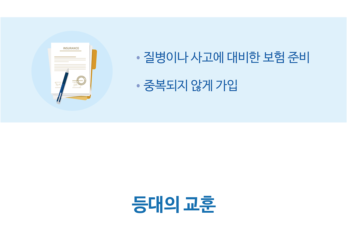 투자자산을 지키는 것이 보험이다. 만약 보험이 없으면 아무리 투자로 자산을 불렸다고 해도 한순간에 무너질 수 있다. 그래서 질병이나 사고에 대비한 보험을 준비해야 한다. 보험은 투자가 아닌 비용(Cost)이다. 즉, 없어지는 돈이다. 그래서 적당히 중복되지 않게 가입하는 것이 중요하다. 브레이크 성능이 좋은 자동차를 구입해야 맘 편하게 운전하며 달릴 수 있다. 갑작스러운 상황이 발생해도 안전하게 멈출 수가 있기 때문이다. 보험이 적당히 준비가 되어 있어야 마음껏 투자를 할 수 있다.