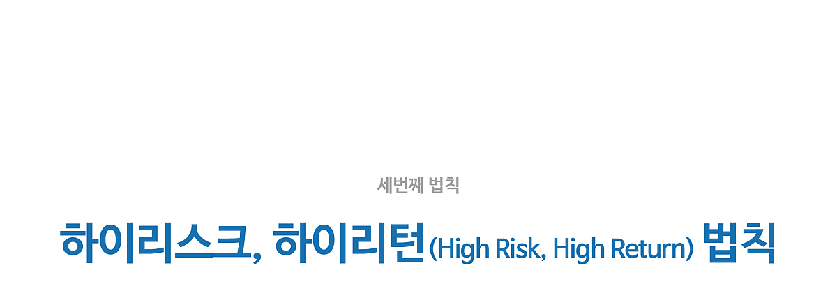 고위험 고수익의 법칙이다. 투자자들에게 있어 가장 잘 알려진 원칙이면서 실전에서는 가장 잘 지켜지지 않는 원칙이기도 하다. 위험이 높으면 수익이 많고, 위험이 낮으면 수익도 낮다는 아주 평범한 진리이다. 수익과 위험성은 정비례한다는 것이며, 이에 따라 가장 좋은 투자전략은 수익과 위험을 최적 수준으로 관리하는 것이다. 그런데 보통 사람들은 위험을 보지 않고 수익만 보기 때문에 문제가 생긴다. 예를 들어, 은행에서는 예금자보호를 위해 한 기관당 개인별로 5천만원까지 원리금을 지켜 주기 때문에 예금, 적금 등은 안전하다고 볼 수 있지만, 연 이자는 불과 2% 내외이다. 그런데 채권이나 주식과 같은 투자 상품들은 투자 원금에 대한 별다른 보호 장치 없이 가격이 하락할 위험이 있기 때문에 수익은 4%, 8%까지 지급될 수 있는 것이다. 심지어 폰지 사기와 같은 투기꾼들은 월 20%의 고수익을 이야기하기도 하고, 유사코인을 유도하는 사람들은 3천배, 4천배를약속하기도 한다. 물론 이러한 수익률이 절대 나오지 말란 법은 없다. 하지만 분명한 것은 손실의 가능성도 그만큼 크다. 투자격언에 "공짜 점심은 없다"라는 말이 있다. 세상은 절대로 나의 돈을 공짜로 불려 주지 않는다. 높은 수익률을 제시받으면 반드시 질문하고 알아야 한다. 어떤 위험이 있는지에 대해서 말이다.