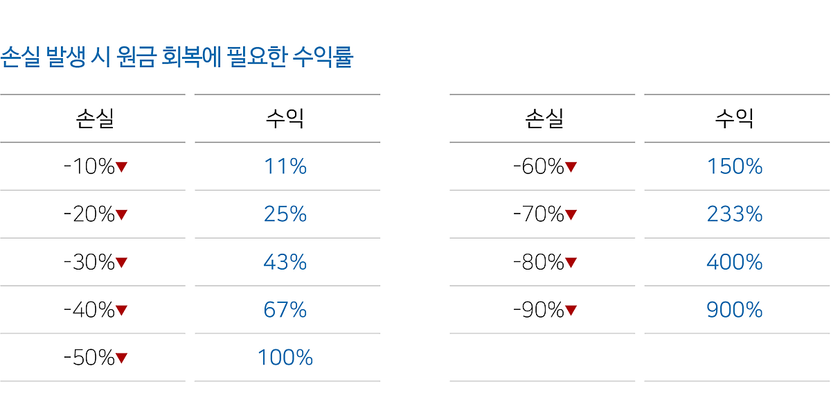 투자의 귀재라 불리는 워런 버핏은 투자의 제1원칙은 "원금을 지키는 것"이라고 하였고, 제2원칙은 바로 "제1원칙을 지키는 것"이라고 하였다. 원금 보존이 그만큼 중요하다는 말이다. 가령, 원금 1천만원을 투자하여 6개월 만에 원금이 반 토막 되었다고 가정해 보자. 그렇다면 1천만원이 500만원이 되었기 때문에 수익률은 -50%가 된다.(수익률은 판 가격에서 산 가격을 빼고 이를 산 가격으로 나눈 후 100을 곱한 값이다) 그리고, 이후 6개월 동안은 현명한 투자를 한 결과 다시 원금인 1천만원을 회복하였다고 한다면 이때의 수익률은 어떻게 되는가? 500만원으로 500만원을 벌었기 때문에 수익률은 100%가 된다. 그러면 떨어진 가격도 500만원이고 오른 가격도 500만원으로 동일한데도 불구하고 떨어진 때의 수익률은 -50%이고, 오른 시점에서는 수익률이 +100%가 된다. 떨어진 6개월의 기간에 올라간 6개월을 합쳐 연 수익률은 0%가 되지만, 올라가기 위해 필요한 6개월간의 수익률은 떨어질 때보다 2배의 수치가 필요한 것이다.(수익률 -50%가 된 후, 수익률 +50%가 되는 시점의 가격이 750만원이라고 생각하면 쉽게 이해된다.) 그만큼 원금을 지키지 못했을 때 한번 떨어진 손실을 만회하기가 쉽지 않다. 워런 버핏의 원칙처럼 투자의 성공을 거두기 위해선 원금을 지키는 것을 최우선으로 삼아야 할 것이다.