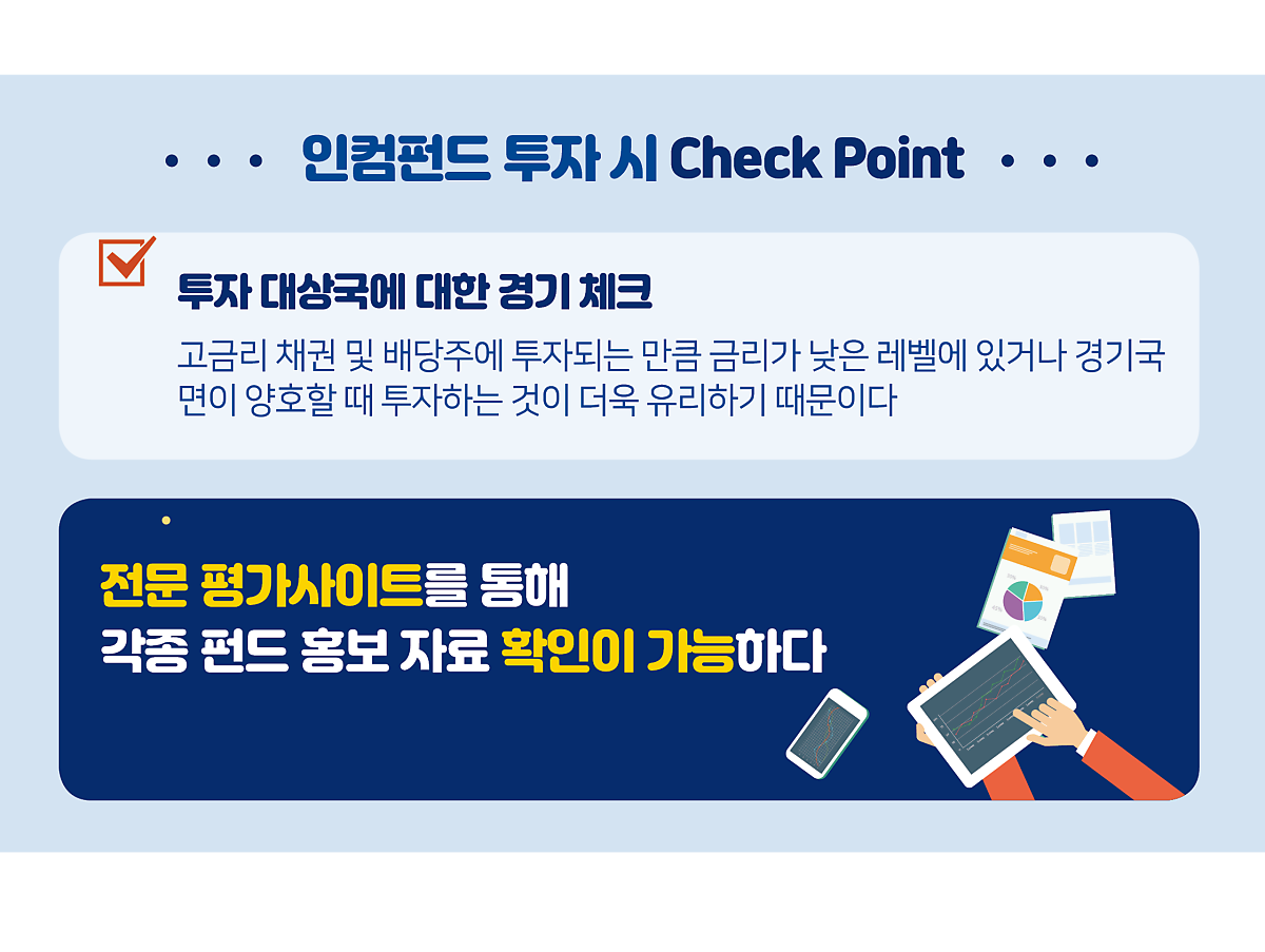 인컴펀드 투자 시 투자대상국에 대한 경기를 체크해 보는 것이 좋다. 대부분 고금리 채권 및 배당주에 투자되는 만큼 금리가 낮은 레벨에 있거나 경기국면이 양호할 때 투자하는 것이 더욱 유리하기 때문이다. 또한 운용사의 해당펀드 운용경험이 오래될수록 성과 또한 안정적이며 더욱 신뢰할 수 있을 것이다.